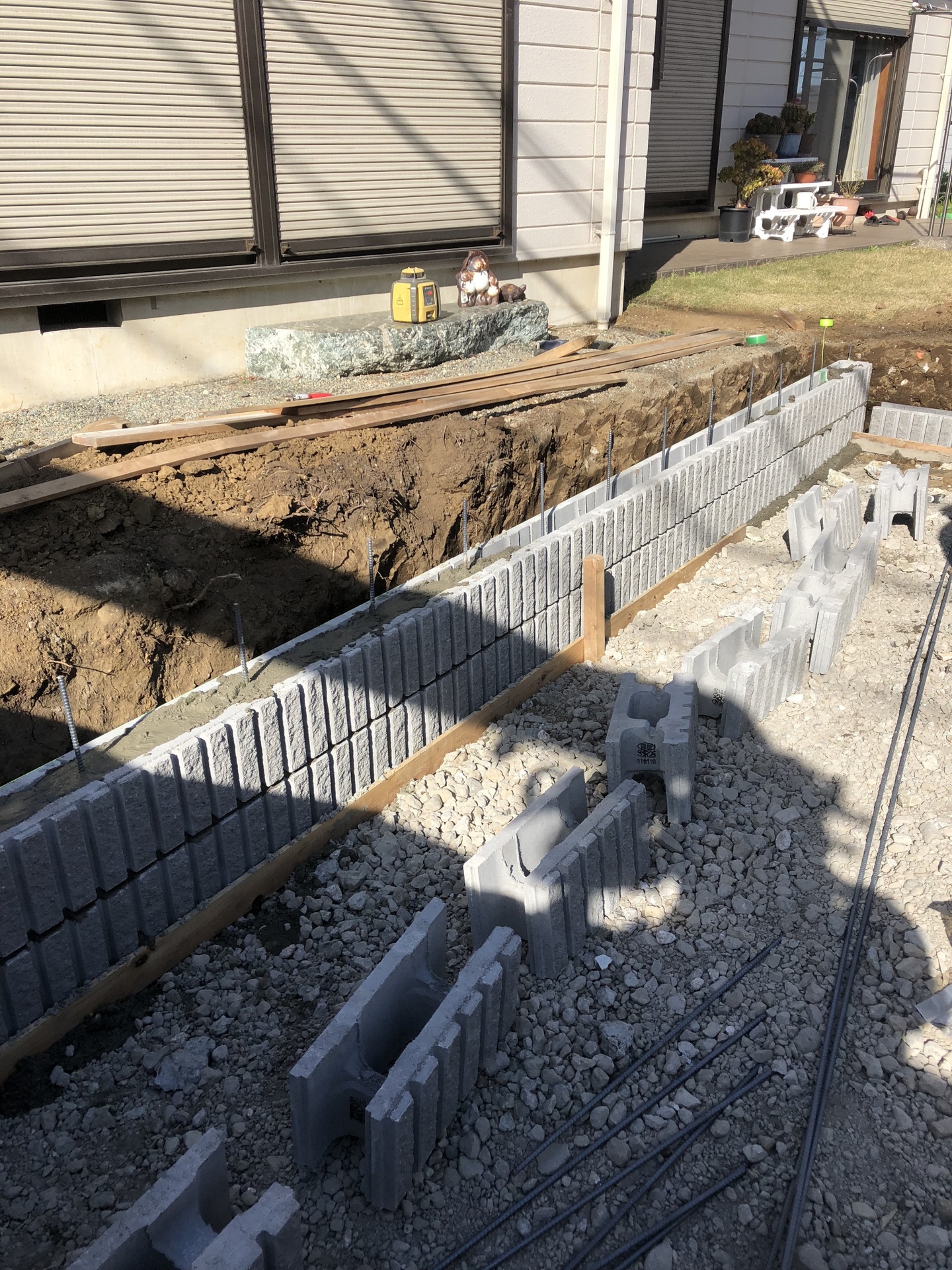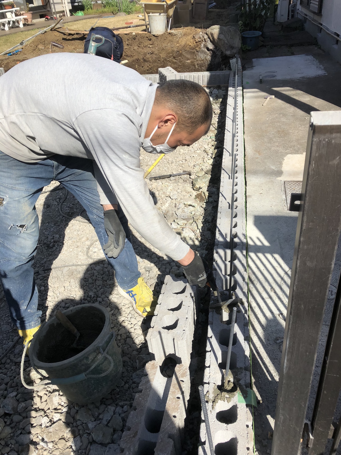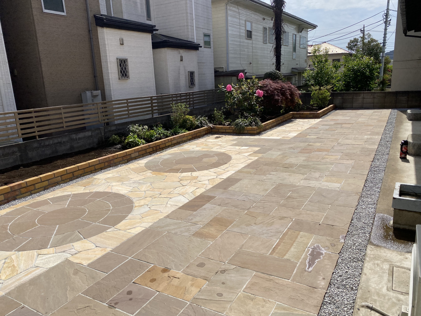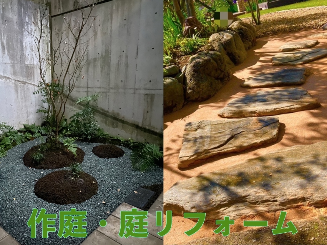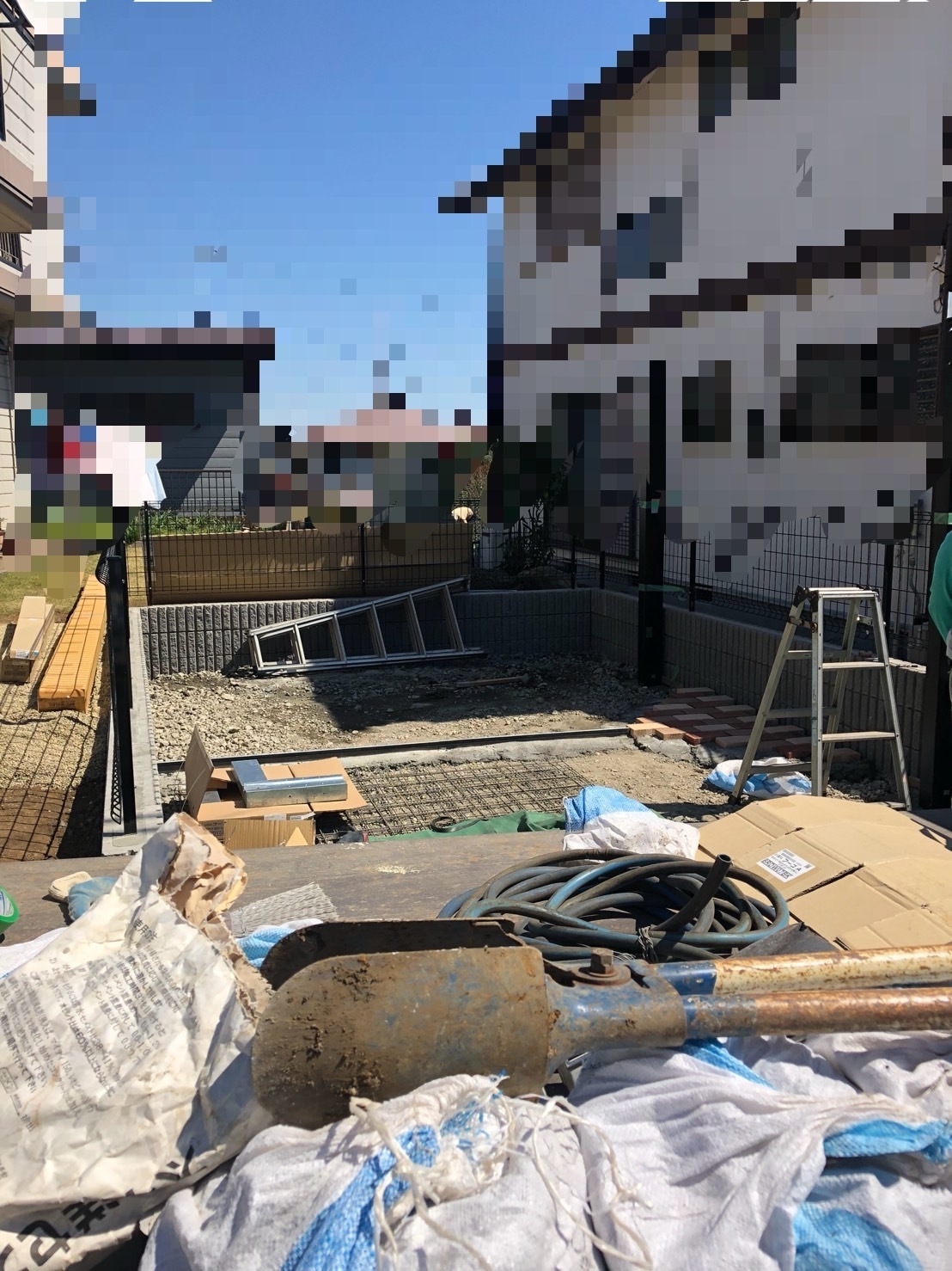 施工内容:庭石、庭木の処分、残土処分、タイル貼り、レンガ積み、移植、土入れ。
