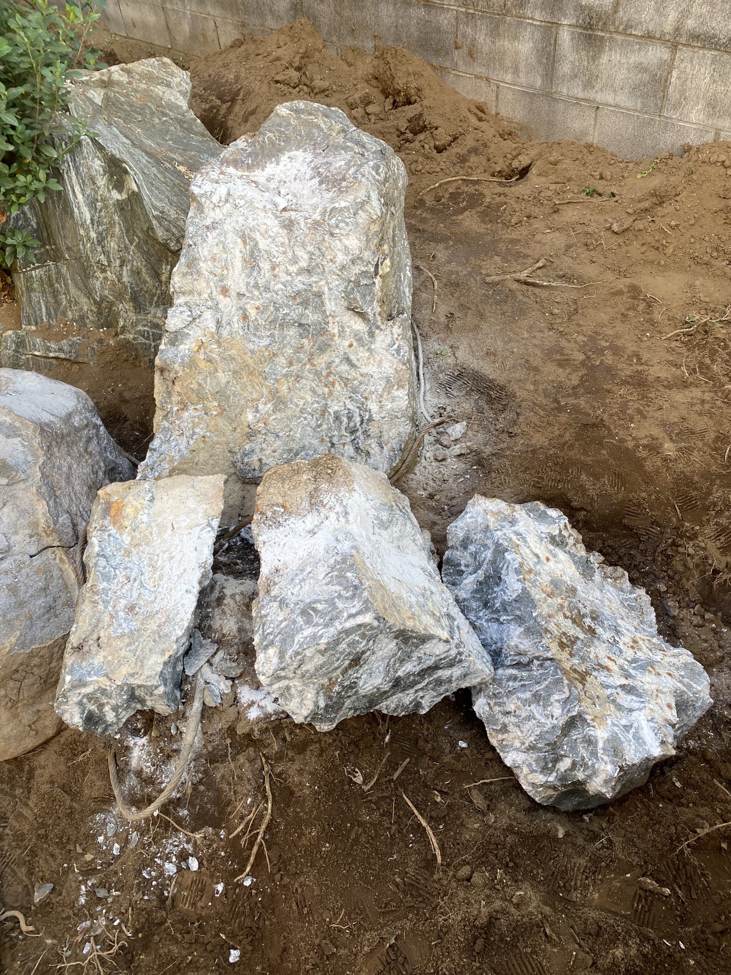 周りを住宅に囲まれたお庭の為、重機を使わずに人力で庭石を割り、搬出。