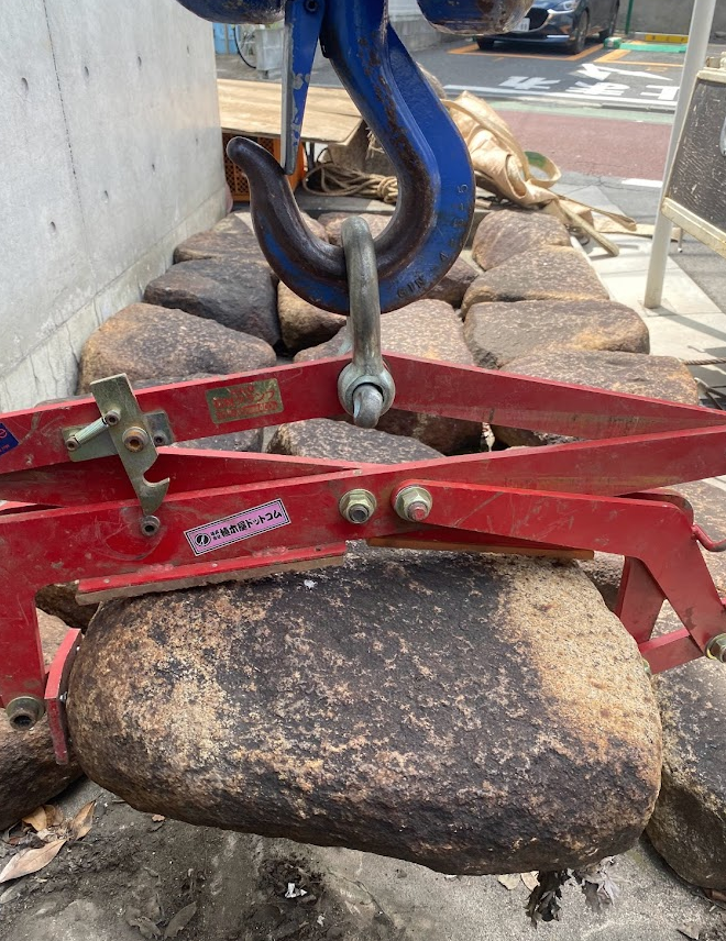 クレーンによる庭石移動