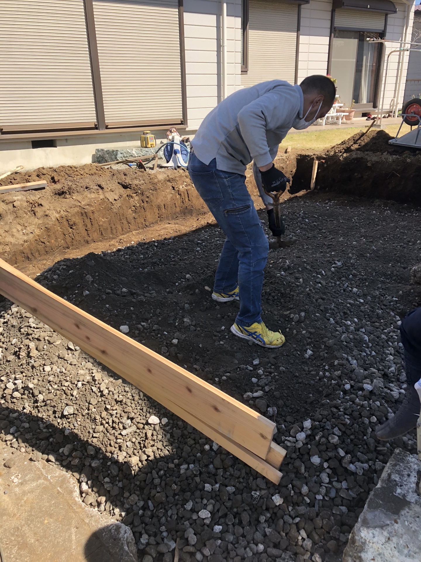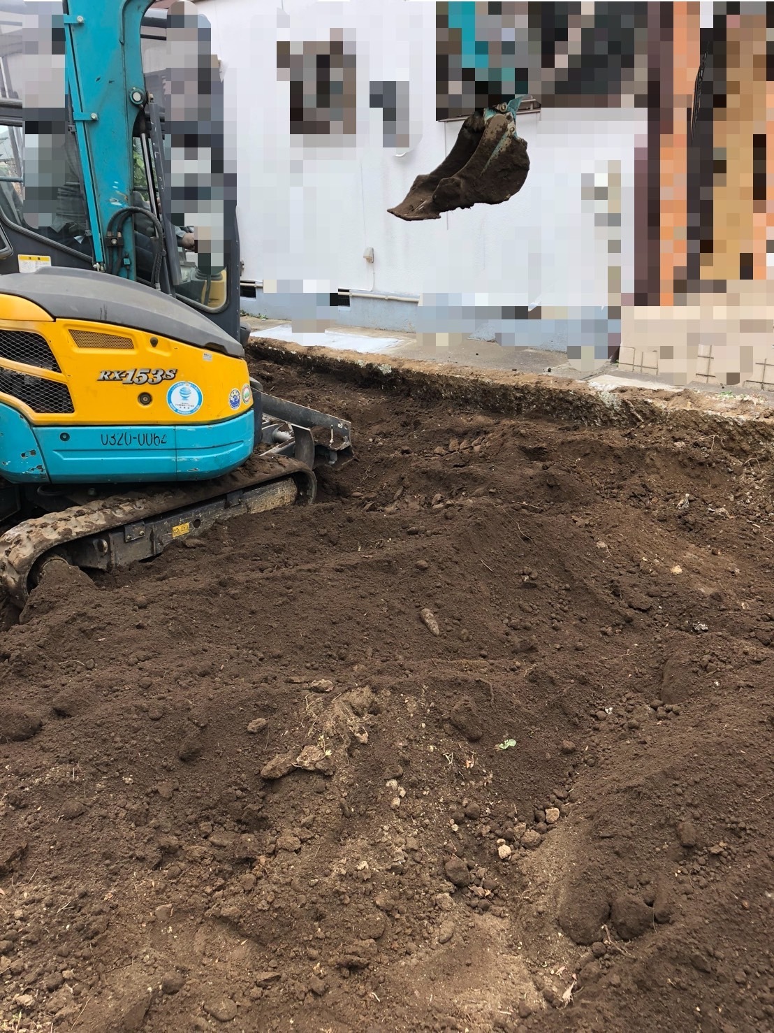 施工内容:庭石、庭木の処分、残土処分、タイル貼り、レンガ積み、移植、土入れ。
