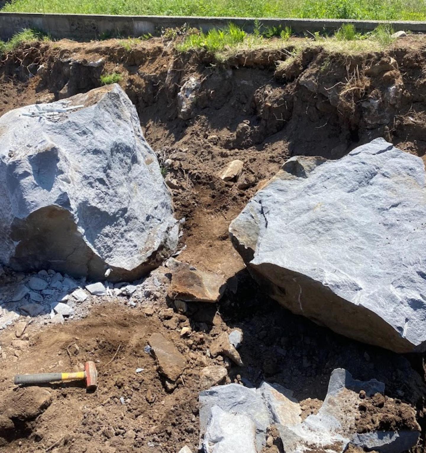 本現場では セリ矢工法を用い、振動と騒音を抑えながら大型庭石を分割し、小型重機で運搬、撤去いたしました。